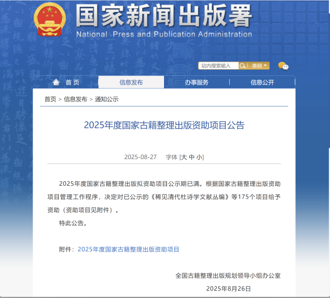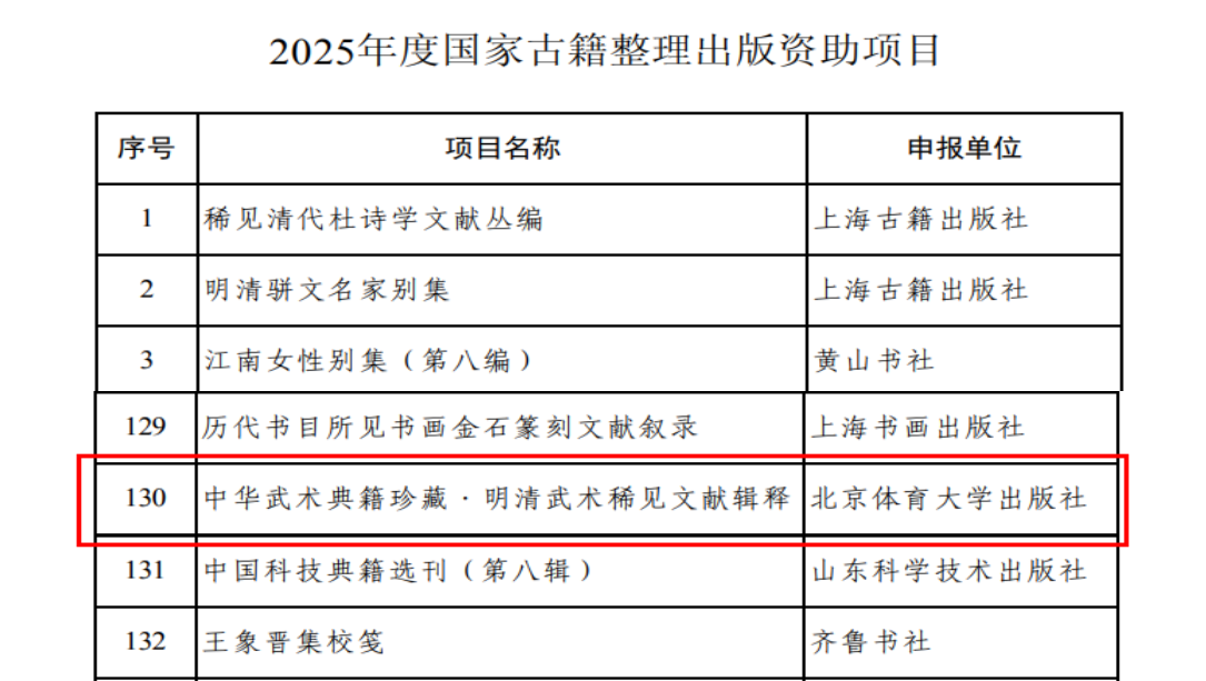 近日,全国古籍整理出版规划领导小组办公室公布了2025年度国家古籍整理出版资助项目,我社申报的《中华武术典籍珍藏·明清武术稀见文献辑释》成功入选,这是继《中华武术典籍珍藏·中国武术研究院院藏清抄本校释》之后,我社图书再度获得国家古籍整理出版专项经费资助,体现了我社在体育文献整理出版领域的持续深耕与专业实力。